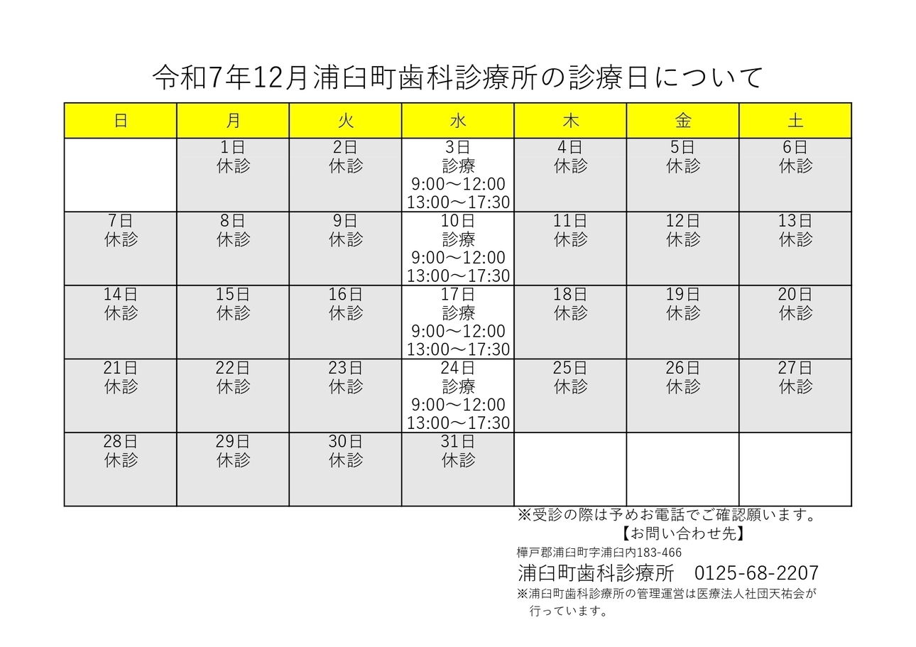 (※上記以外にも都合により休診となる場合があります。あらかじめお電話等でご確認ください)